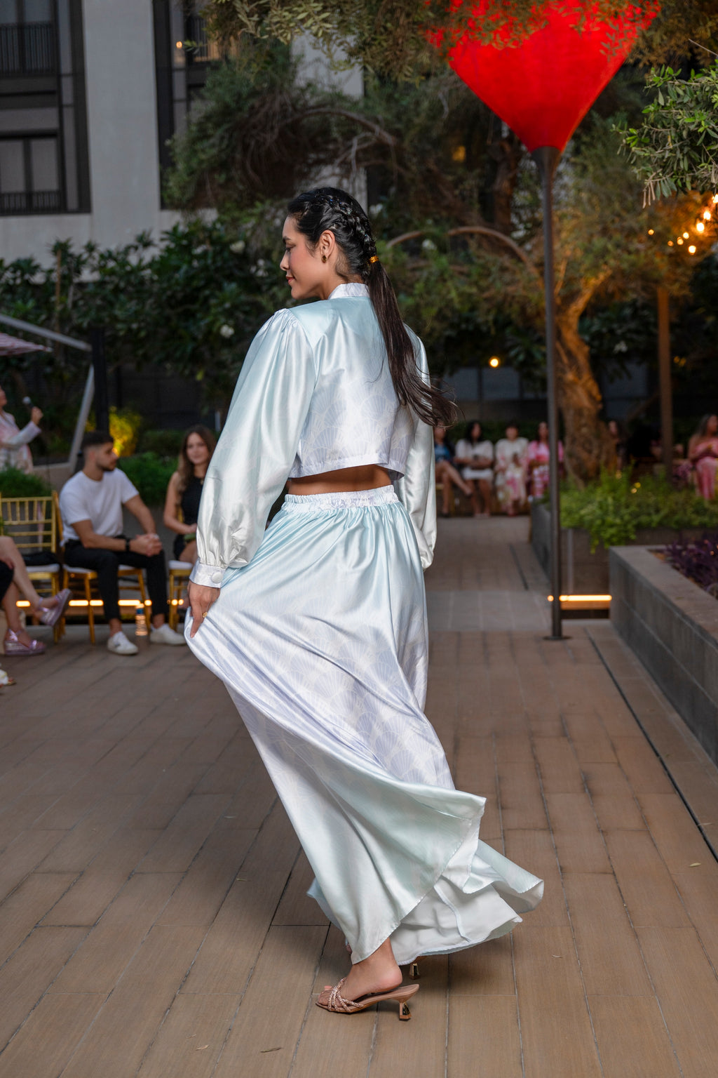 Introducing our elegant skirt, designed to perfectly match our shirts and jackets. Crafted from a luxurious blend of silk and spandex, this skirt offers both style and comfort.