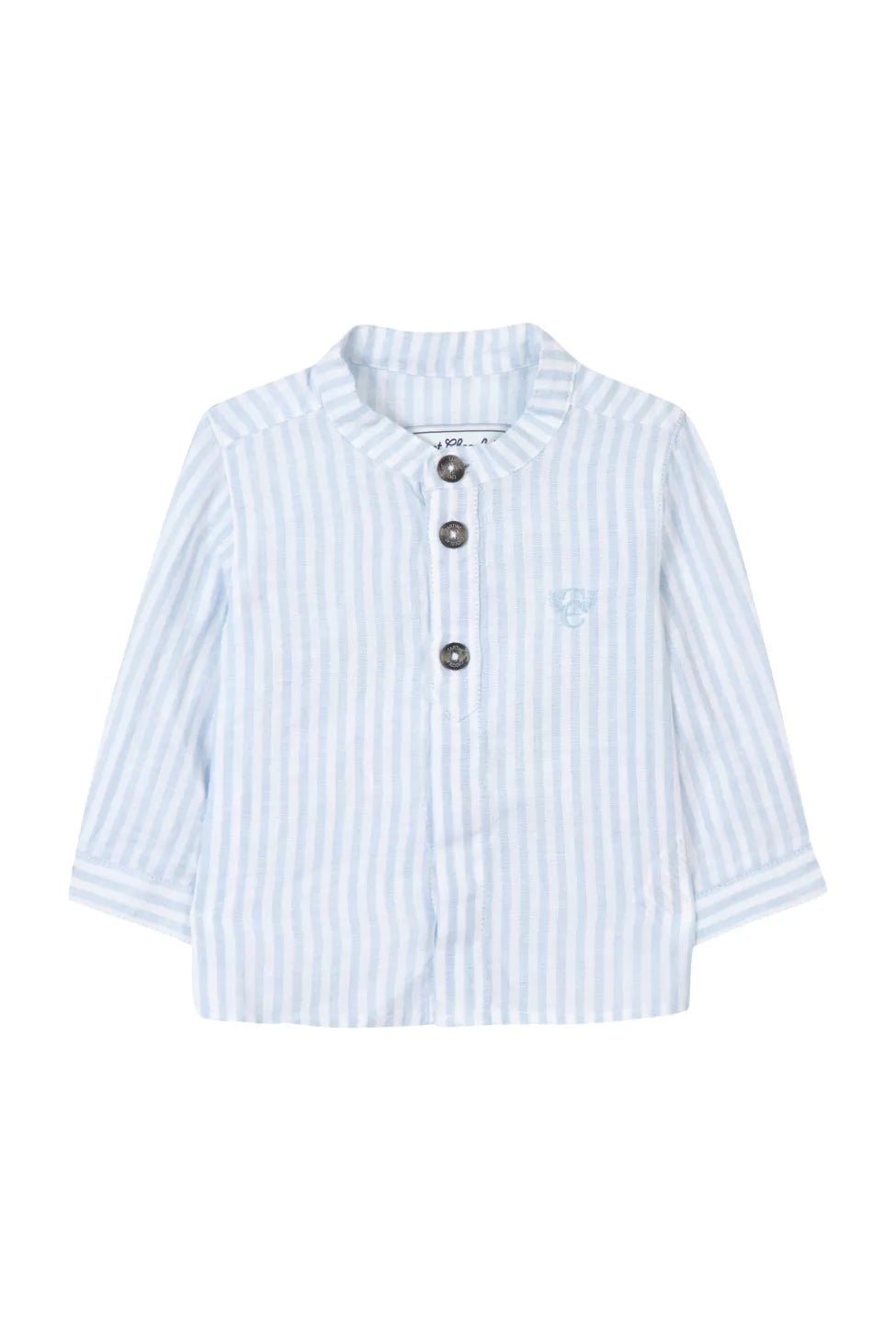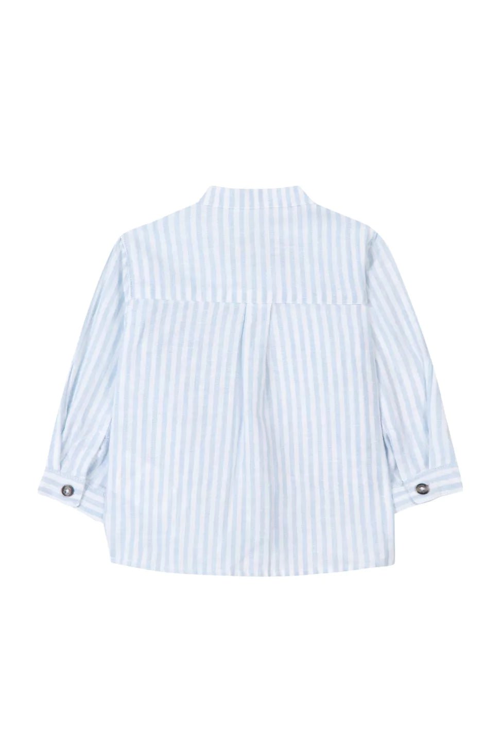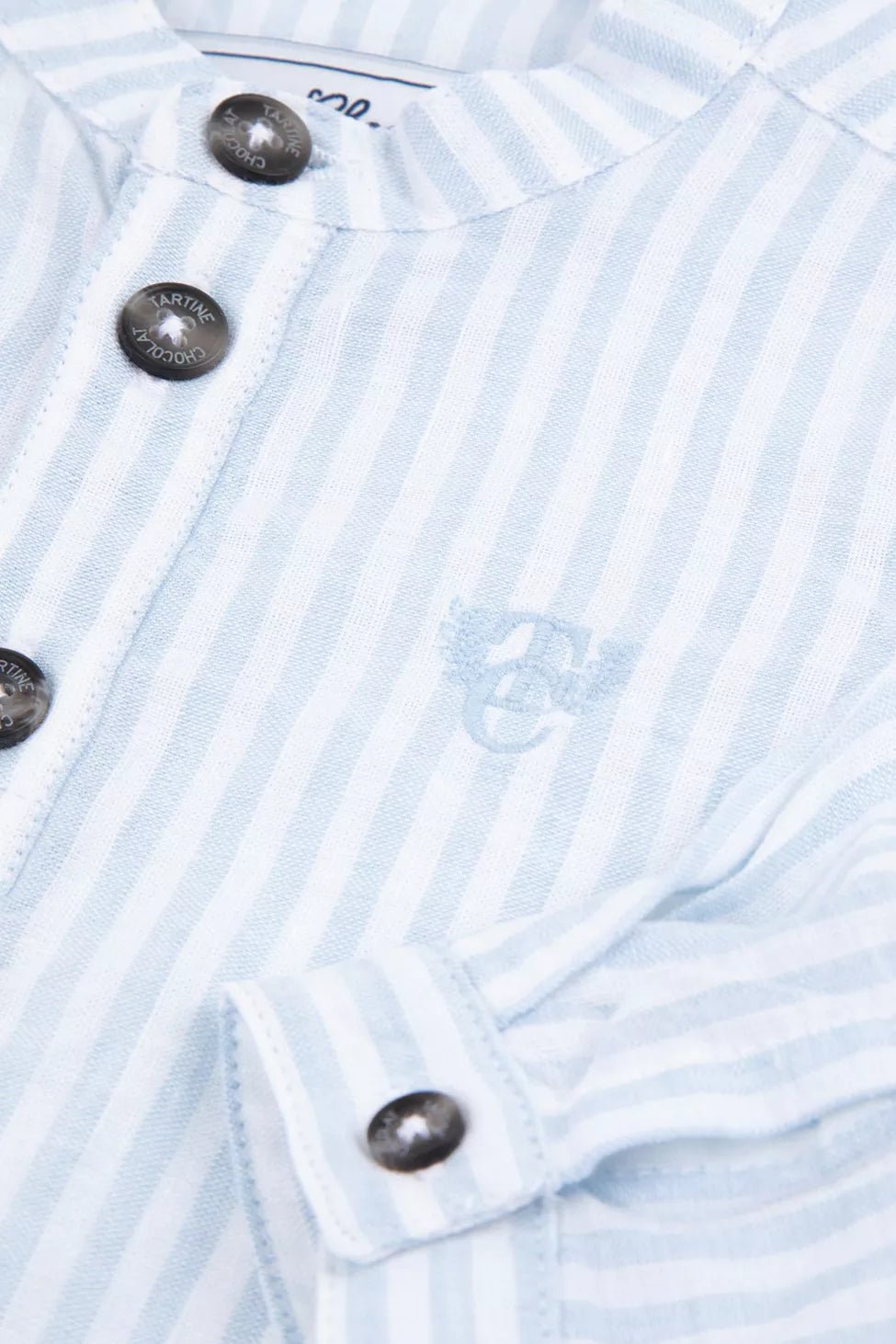 Forward to the summer with this pretty Shirt made of linen and cotton. The fine Stripes mixed with the beautiful and discreet color Sky blue bring refinement and naturalness. The Mao collar and the TC signature modernize the Shirt for a chic summer.