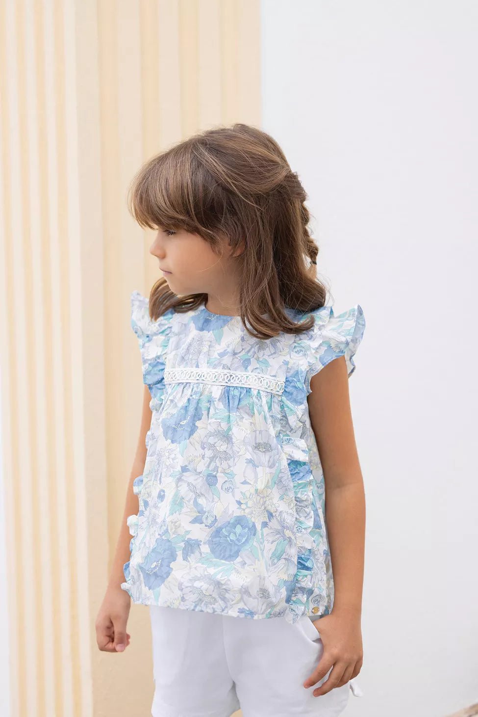 With its 100% Cotton material, your daughter will be comfortable and at ease for all moments of her day. Its beautiful ruffled sleeves and its braid of Race on the front give an original touch to this beautiful Blouse.