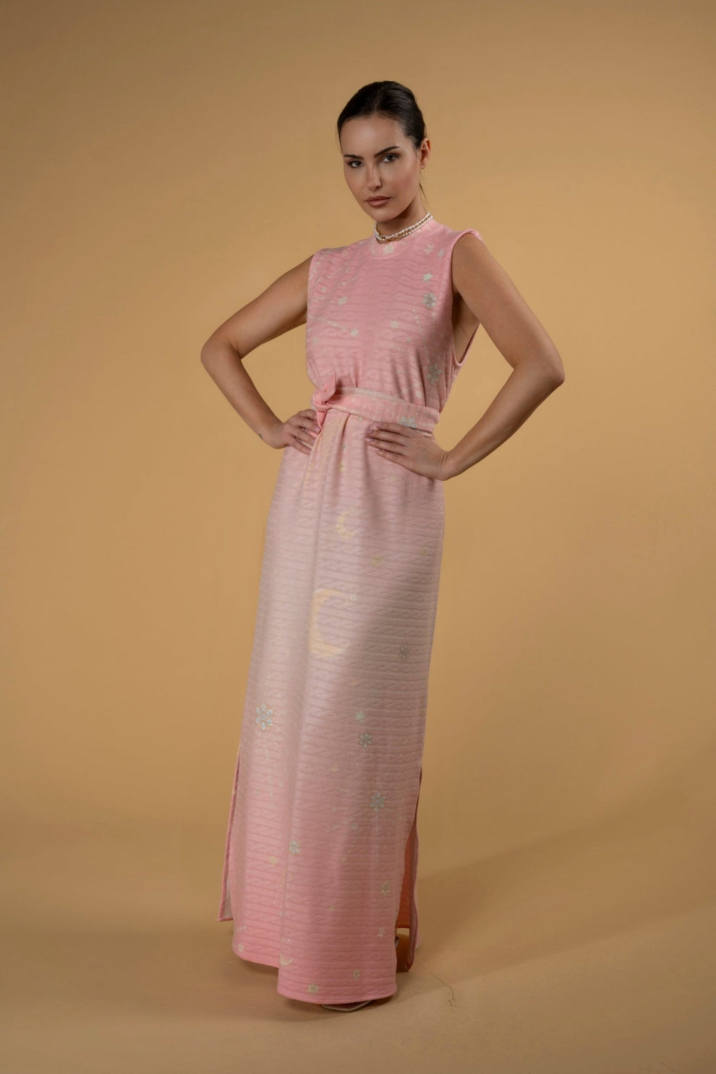 The intricate patterns, inspired by the mesmerizing jewelry collections of Bayt Damas, are designed and printed in Dubai. Each dress reflects the elegance and detailed craftsmanship of fine jewelry, bringing a unique story to your ensemble.