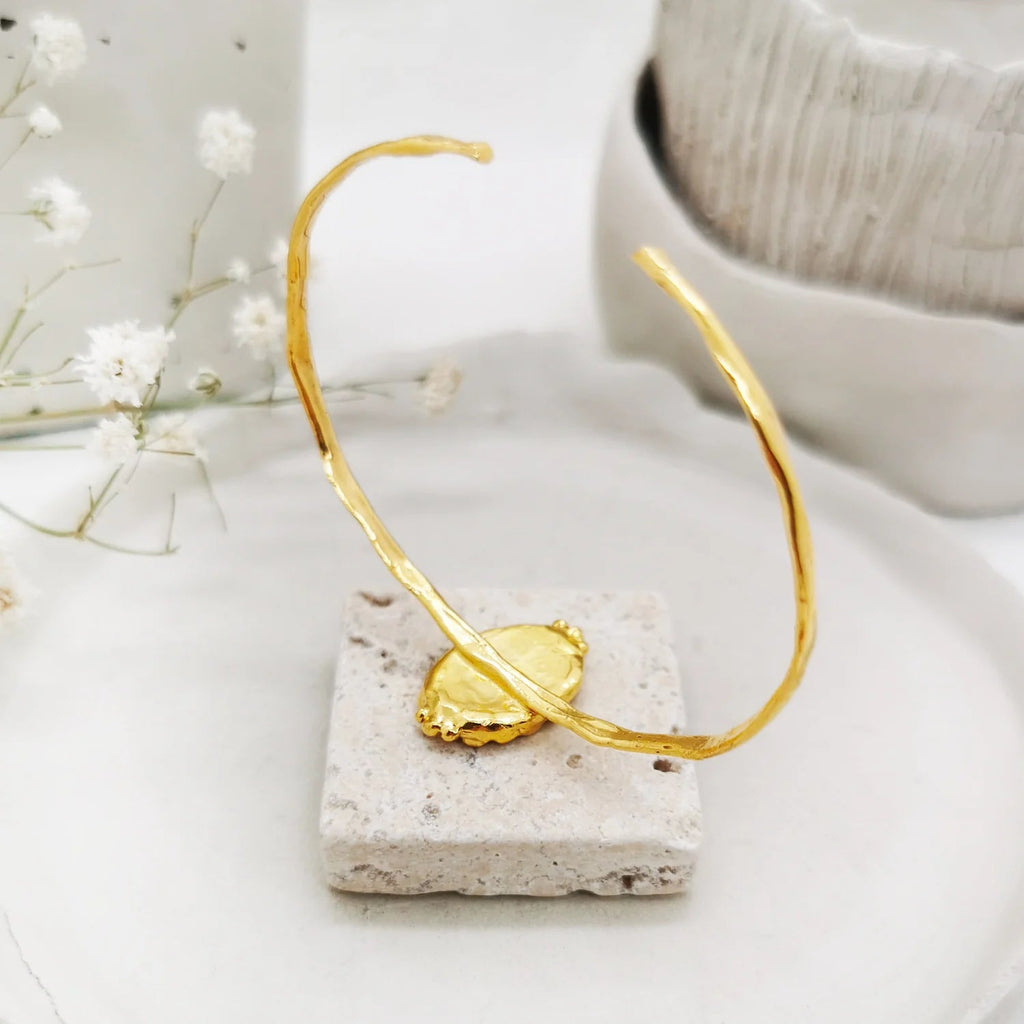 Alliance of preciousness and delicacy, the bracelet Giali is an adjustable open, adjustable size, gilded with 24 carat gold 3 microns. It is a fine piece sculpted in wax and made in Paris, adaptable to all wrists, handcrafted in France and adorned with a delicate white and luminous mother-of-pearl. A timeless piece with imperfect shapes.