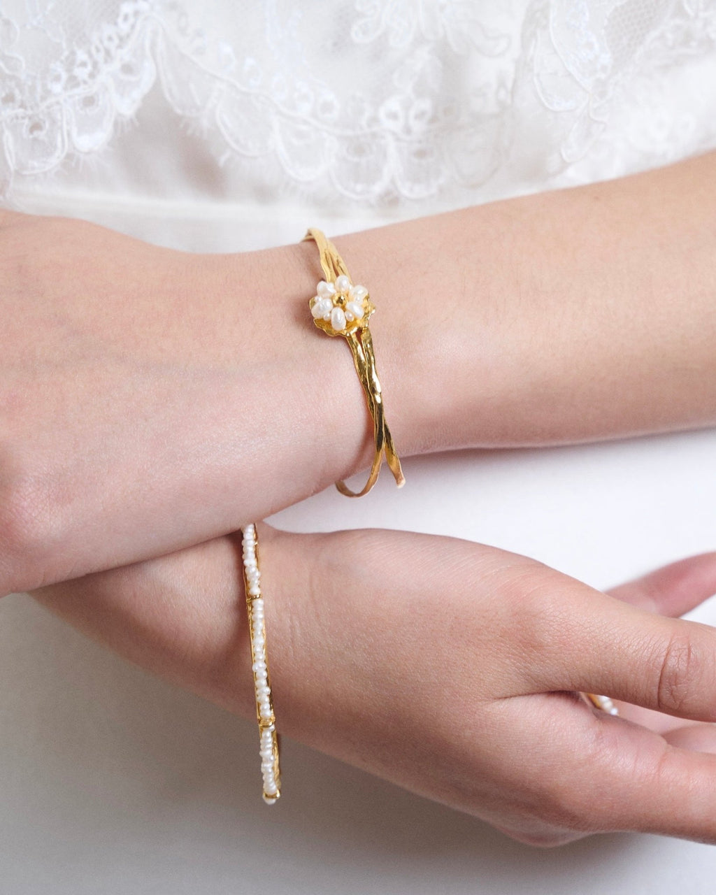 Crafted in our Paris workshop, the Kina necklace features a delicate flower adorned with mother-of-pearl beads. It embodies a subtle balance between preciousness and elegance, adding a refined touch to your outfit while radiating joy and luminosity.
