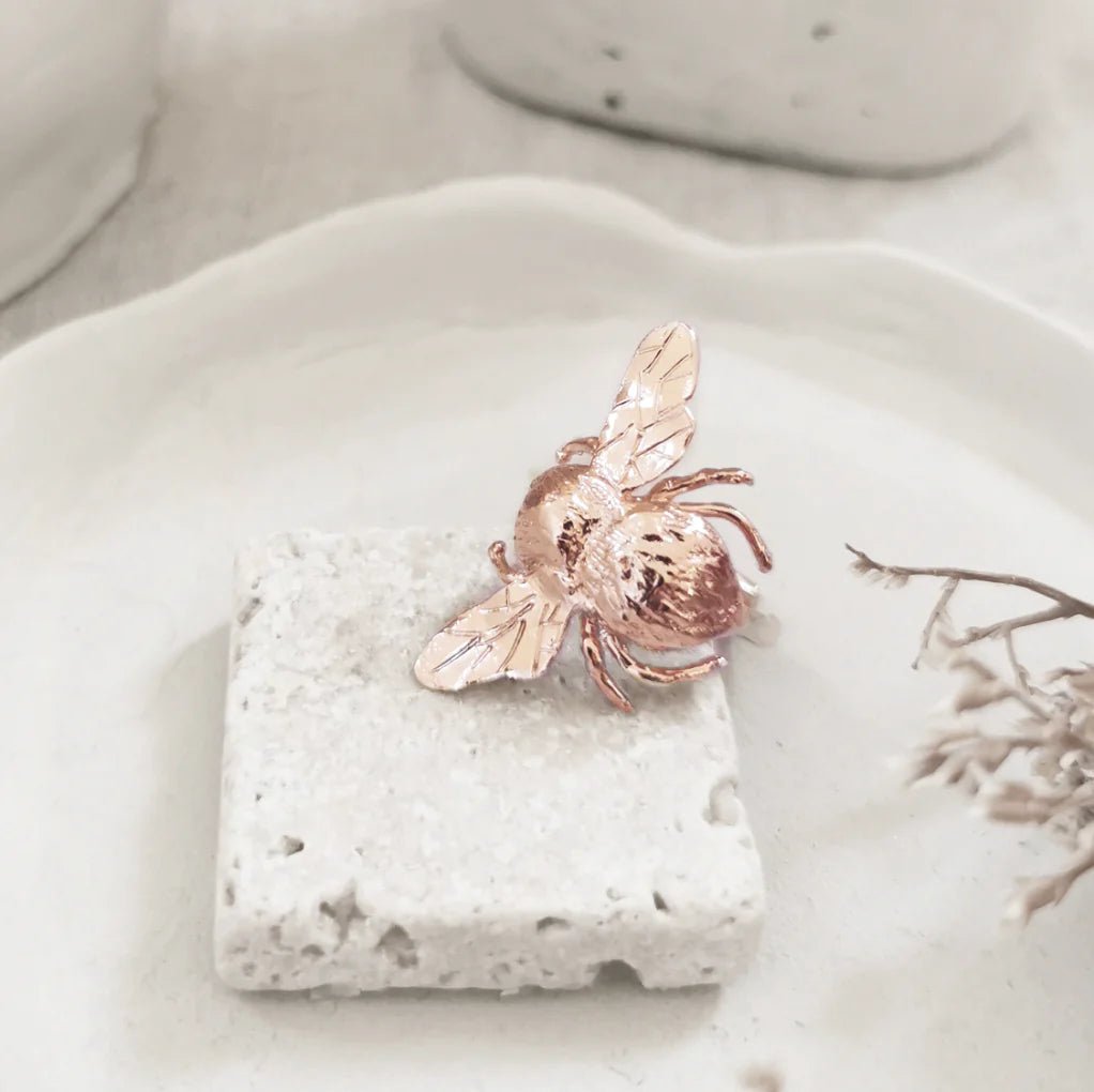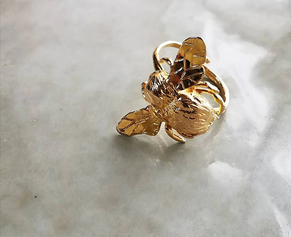 Sculpted in wax and made in Paris, the Cela ring is a best seller of jewelry house. An adjustable ring with a hammered band and a bumblebee charm directly inspired by Irving Penn's famous photo "Bee on lips".
