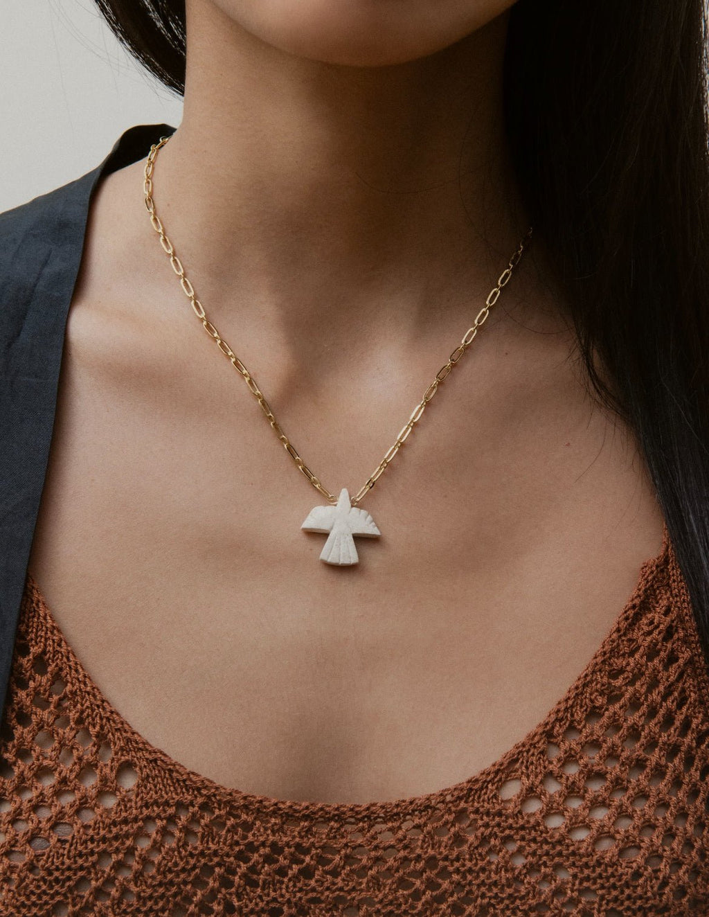 The Pursley necklace celebrates power and spirituality with its natural aventurine pendant, carved in the shape of a majestic bird. Mounted on a golden chain, it embodies a balance between strength and delicacy. Handcrafted in Paris, this unique jewel combines artisanal expertise with timeless elegance.