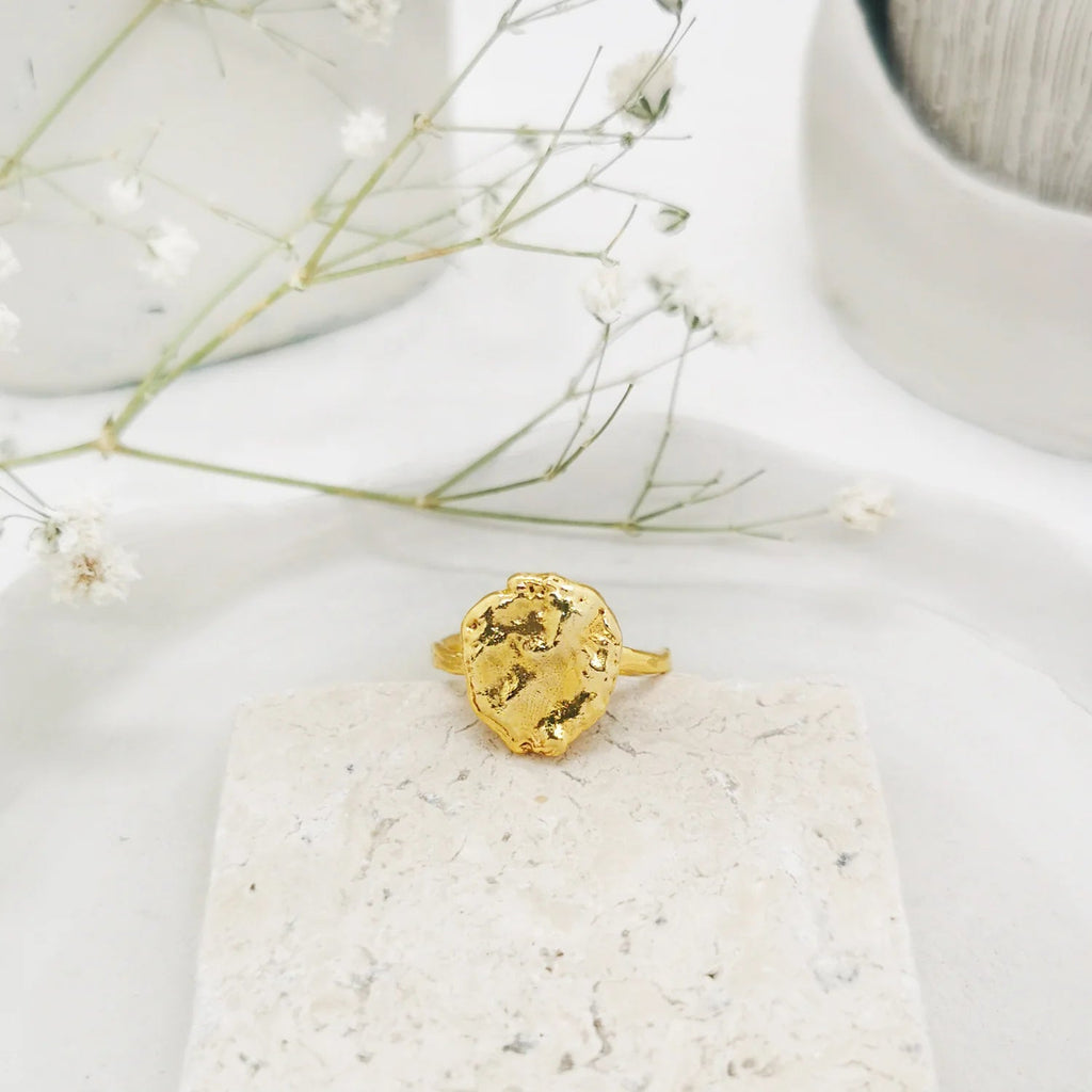 The ring Payos is an adjustable piece handcrafted in France. Warm, capturing the light, this sunny piece with raw and textured lines, will preciously dress your hand.