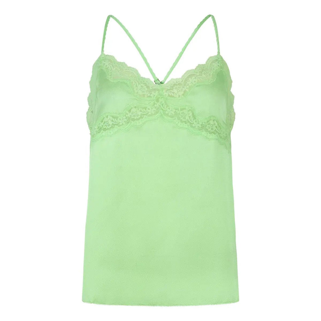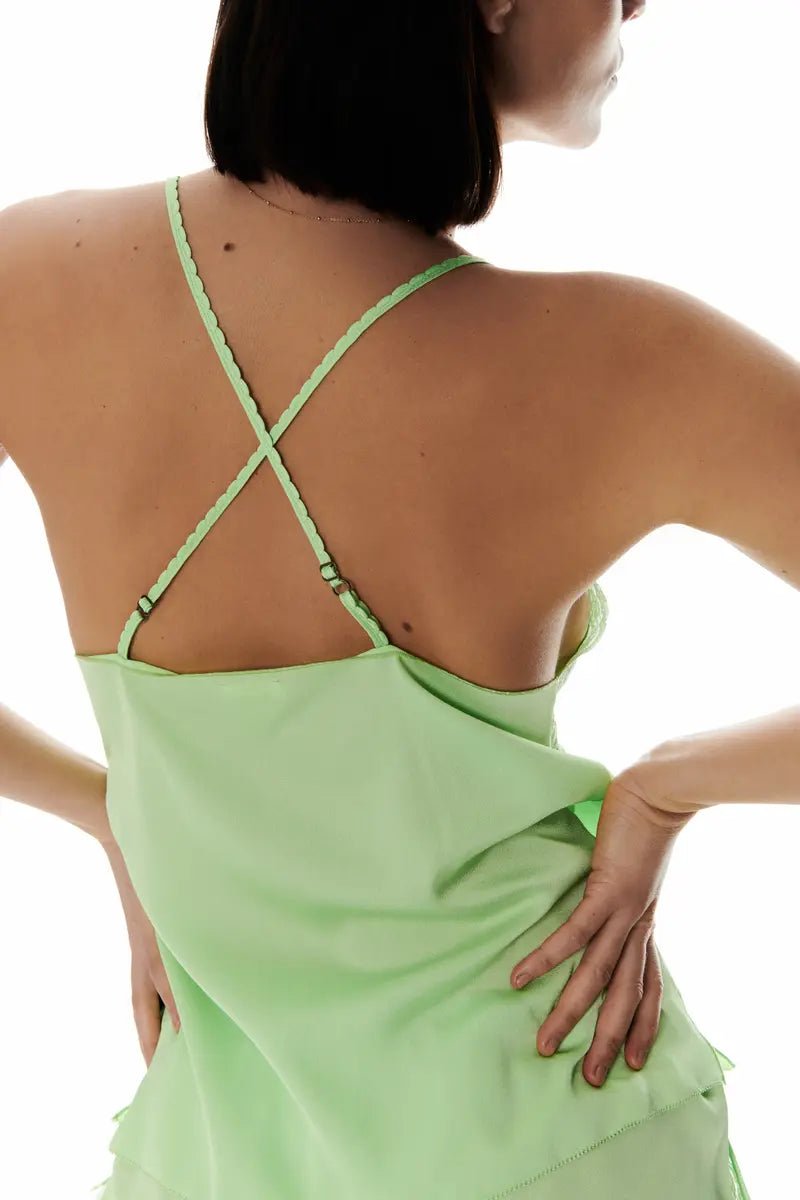 - Adjustable, scalloped shoulder straps criss-cross at the back