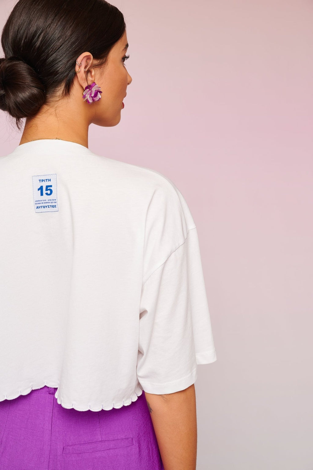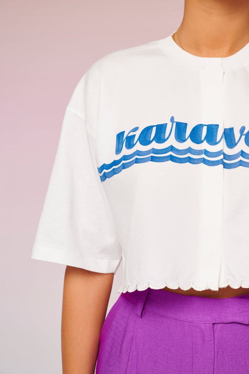 - August Crop Top, embellished W/ Blue Logo Applique and Embrodered Trimed Hem like Waves