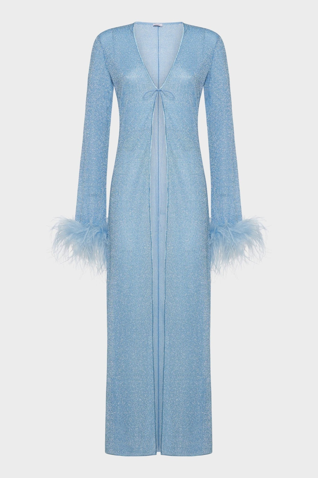 • Must-have piece that will elevate your style to new heights. A floating masterpiece of elegance, this long kaftan combines soft, glossy material with feather accents for maximum glamour.