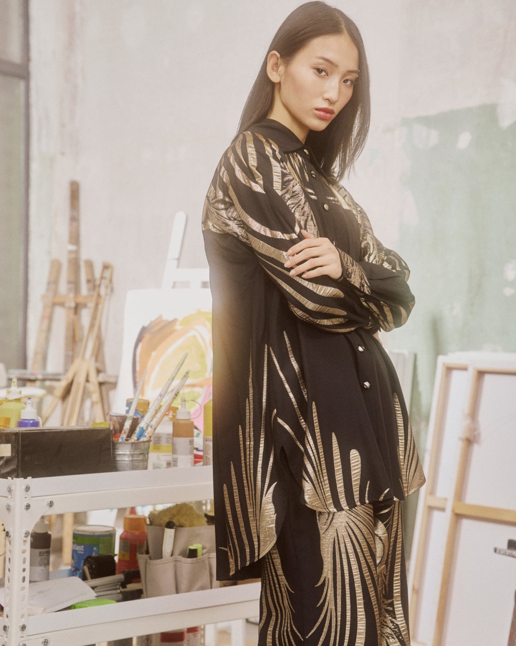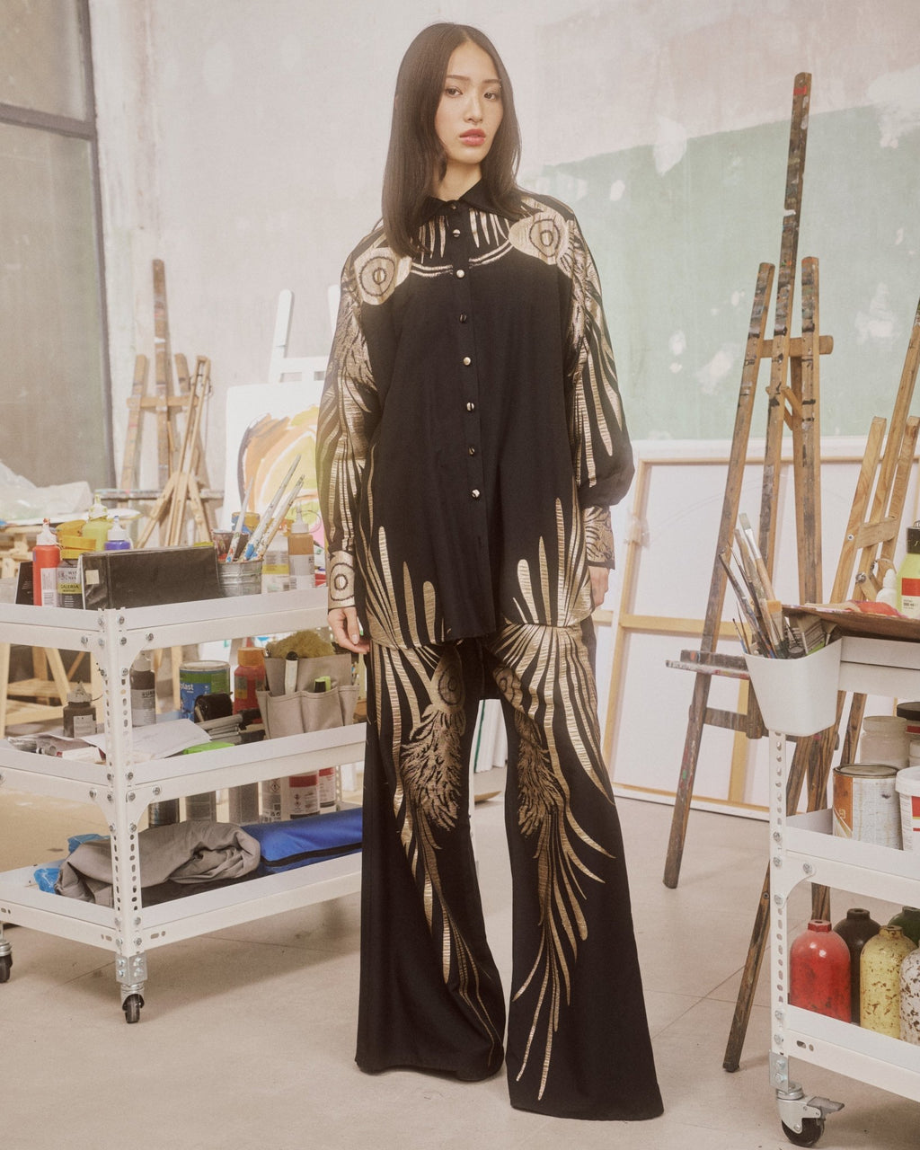 A standout piece from our new collection, this oversized shirt is crafted in a fluid blend of viscose with lurex for a subtle shimmer. The plain base is illuminated with golden art-deco inspired patterns that bring movement and light to the design. Featuring a relaxed silhouette, front button closure, and long sleeves, it balances comfort with statement style. Perfect to wear on its own or paired with the matching trousers for a coordinated look.