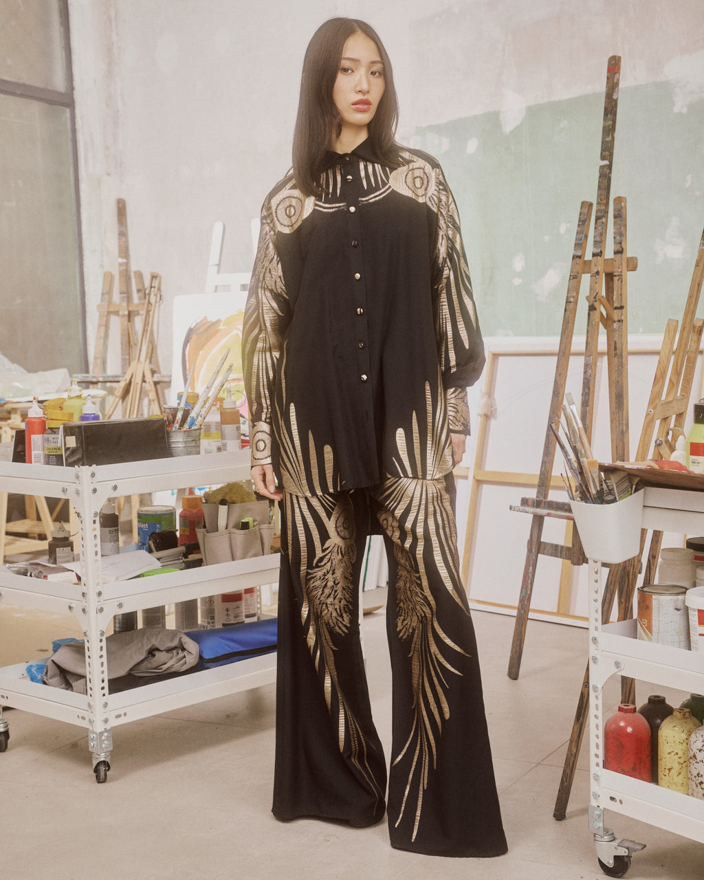 These wide-leg trousers are designed in a viscose blend, offering a lightweight drape with a touch of shimmer. The plain base is highlighted with golden motifs that elongate the leg and create a fluid, elegant silhouette. Pair with the matching oversized shirt for a striking co-ord set, or style separately with a neutral blouse for a sophisticated look.
