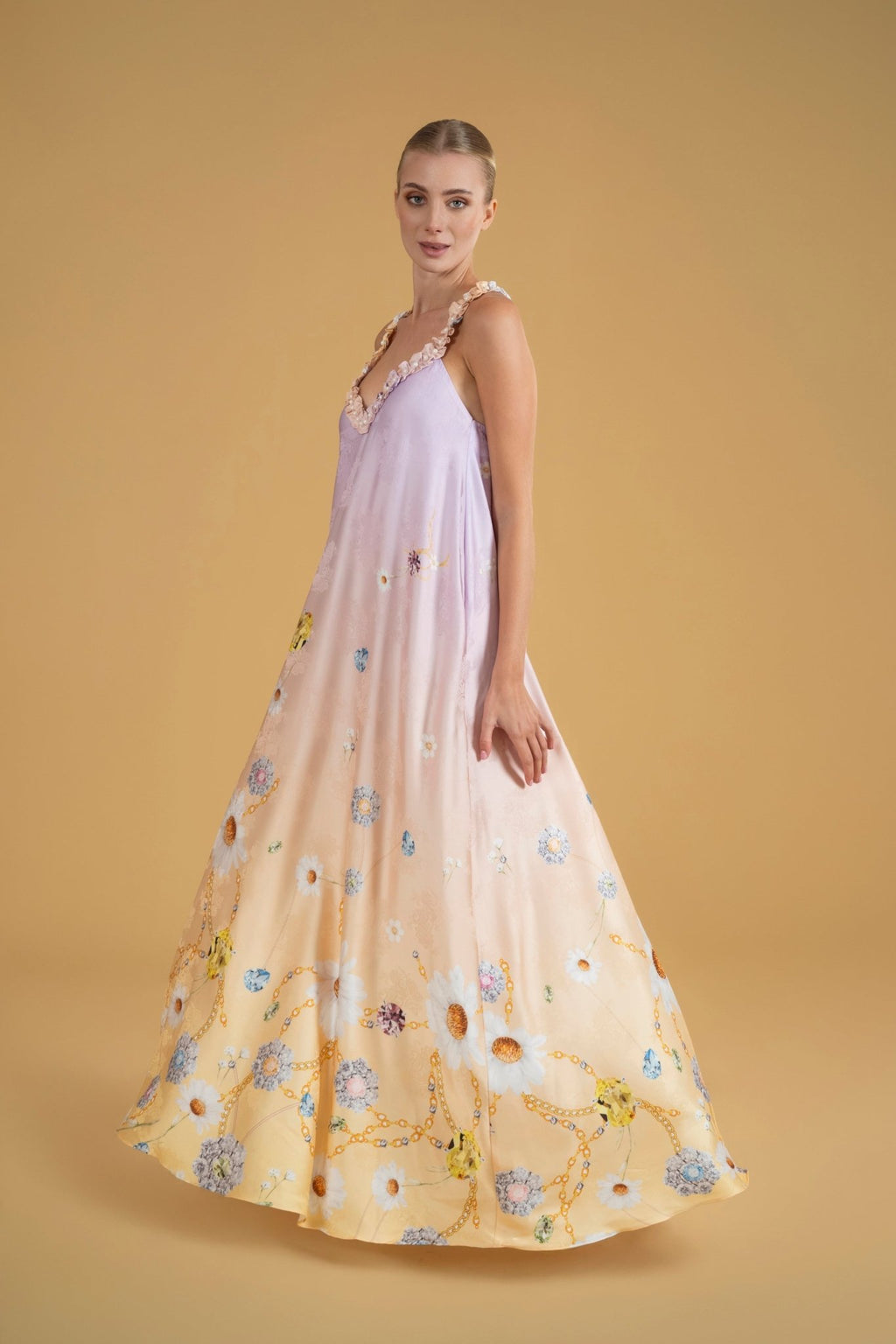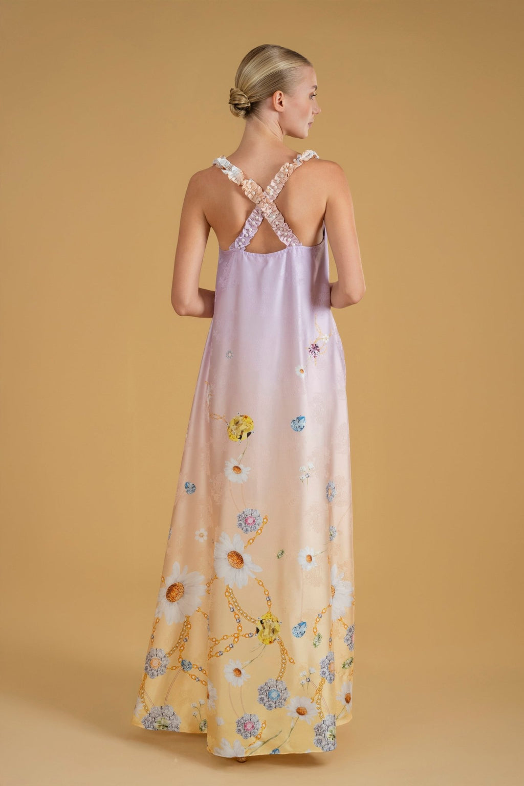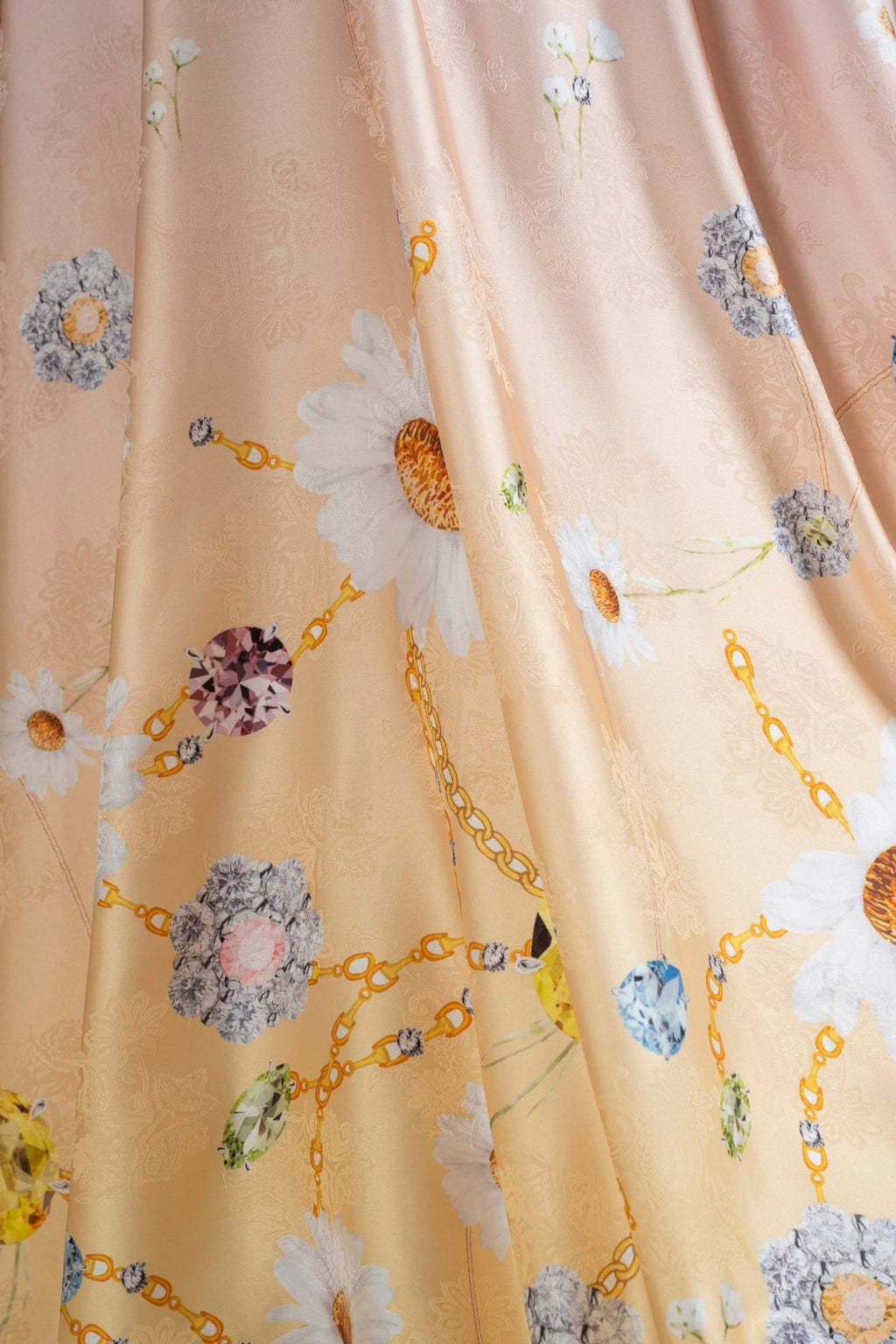 The intricate patterns, inspired by the mesmerizing jewelry collections of Bayt Damas, are designed and printed in Dubai. Each dress reflects the elegance and detailed craftsmanship of fine jewelry, bringing a unique story to your ensemble.