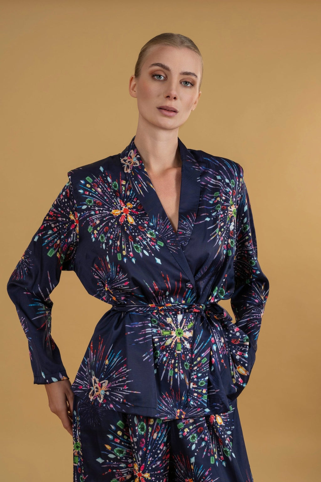 Introducing our elegant Jacket, perfectly designed to match our wide-cut trousers. Crafted from the same luxurious blend of silk and spandex, these Jackets offer an exquisite combination of style and comfort.