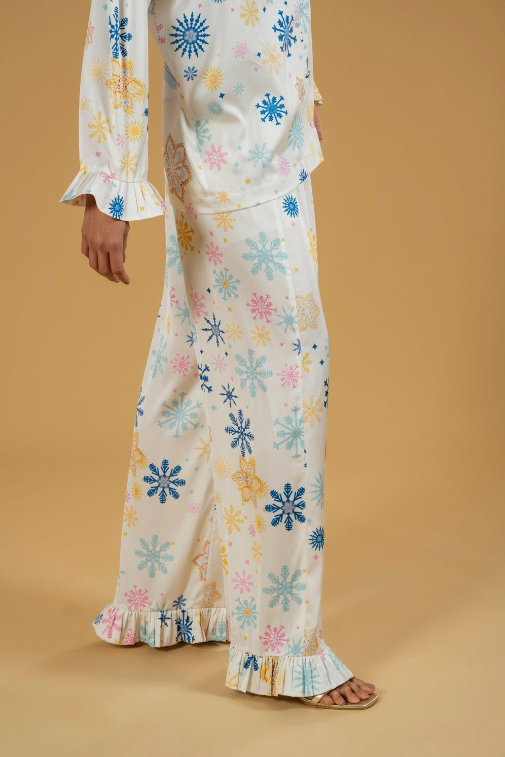 Introducing our stunning wide-cut trousers with a ruffle at the bottom, an exquisite blend of elegance and comfort. Crafted from a luxurious mix of silk and spandex, these trousers promise a beautiful flow and perfect fit.