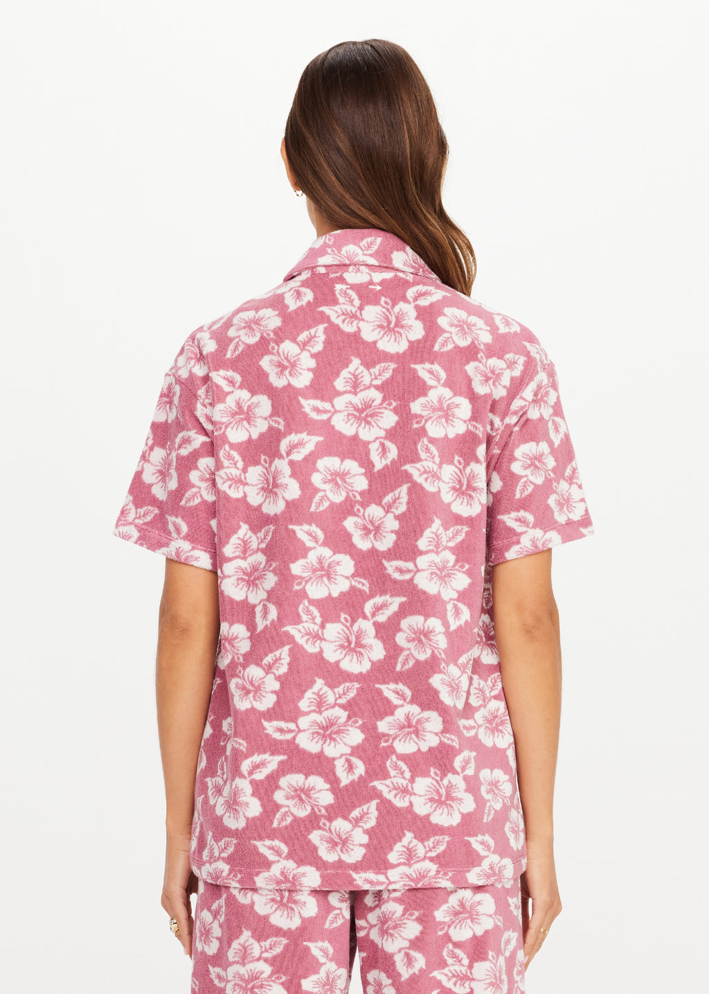 Organic cotton terry jacquard in our pink and cream Lahaina hibiscus